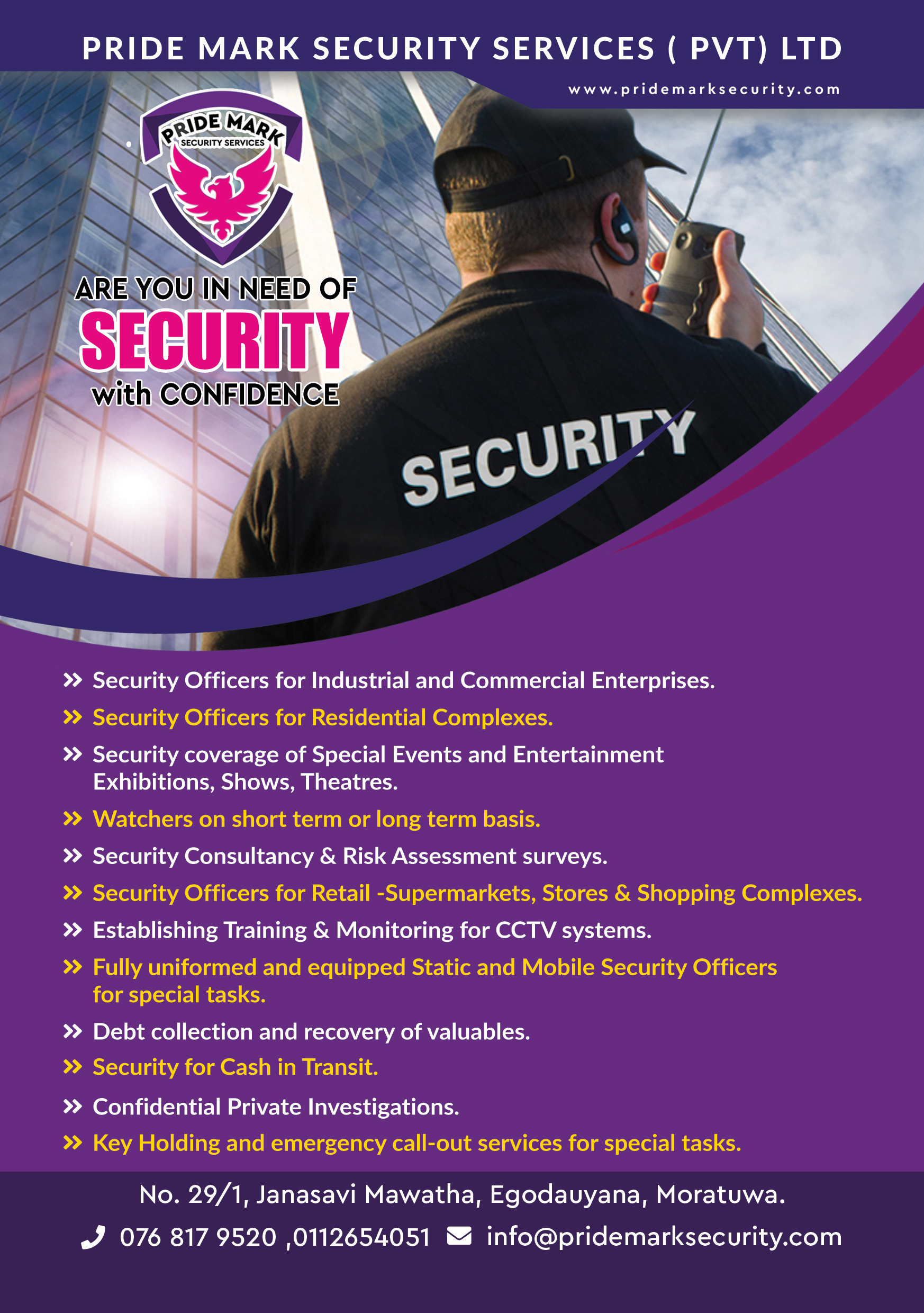 WE ARE COMING SOON PRIDE MARK SECURITY (PVT) LTDPhone :07681795200112654051Location :No 29/1, Janasavi Mawatha, Egodauyana, Moratuwa.Email :info@pridemarksecurity.com